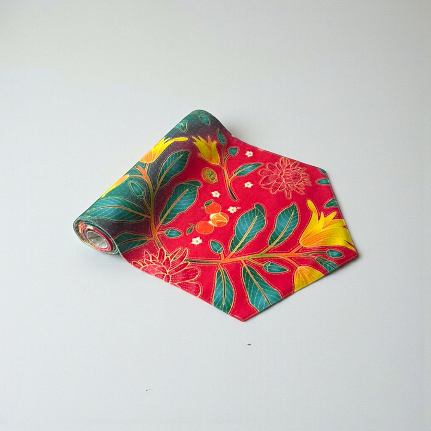Bring the colours of unity and festive joy into every gathering with this vibrant handmade batik table runner. Designed in collaboration with a Malaysian artist, the piece blends Chinese New Year prosperity and Raya harmony into one flowing artwork — celebrating Malaysia’s shared traditions in a single expressive design.